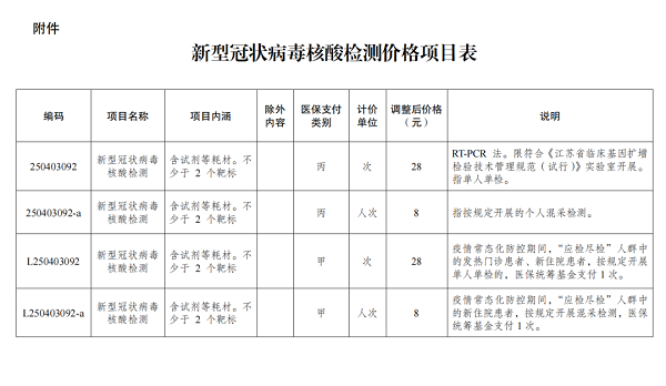 为积极应对疫情防控形势新变化,根据《江苏省医疗保障局江苏省卫生健康委员会关于进一步降低新型冠状病毒核酸检测价格的通知》(苏医保发〔2022〕22号),我市自2022年4月4日零时起,进一步降低新型冠状病毒核酸检测价格。