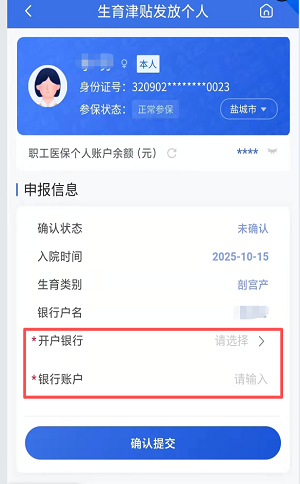第二步:打开江苏医保云APP,点击办事大厅-我要办-生育津贴发放个人,页面显示个人信息,可核对数据并修改银行信息,点击提交即可办理完成。