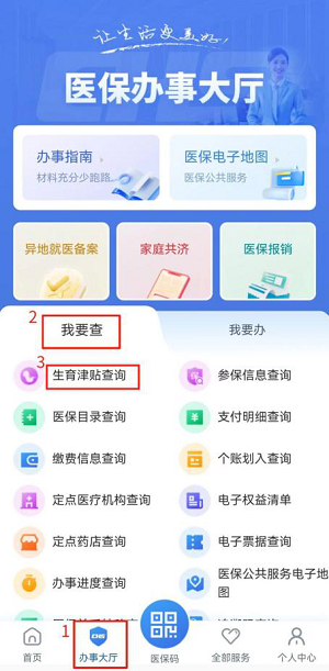 打开江苏医保云APP,点击办事大厅-我要查-生育津贴查询,生育津贴查询页面显示已经核定的信息。