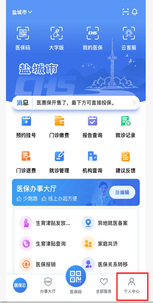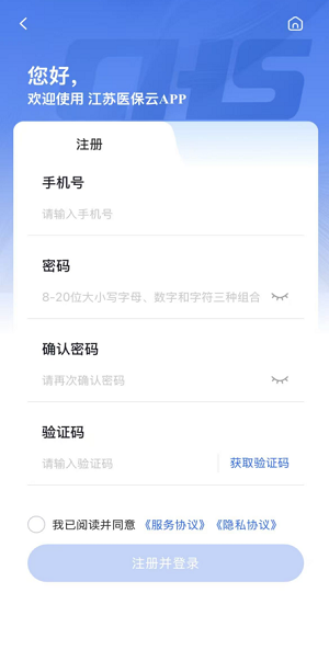 第一步:参保人下载江苏医保云APP,点击个人中心进入登录/注册页面,点击注册并登录即可完成注册。