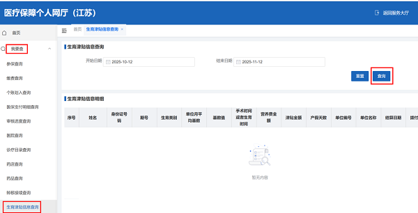 进入江苏省医疗保障局网上服务大厅,点击个人登录-我要查-生育津贴信息查询,可选择开始日期和结束日期点击查询,生育津贴信息明细显示相关个人信息。