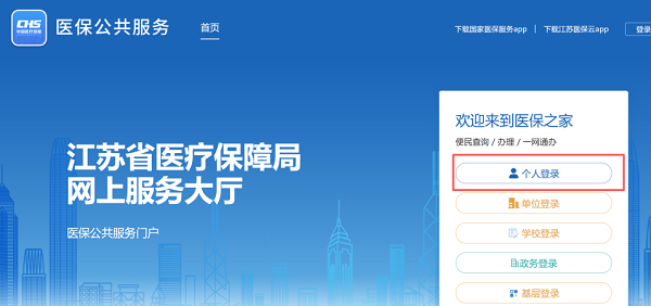 第一步:进入江苏省医疗保障局网上服务大厅平台(https://ybj.jszwfw.gov.cn/#/Index),点击个人登录,选择使用江苏医保云APP账号登录,江苏医保云APP账号需实名认证过且认证成功后修改过一次密码,才能成功登录个人网厅。