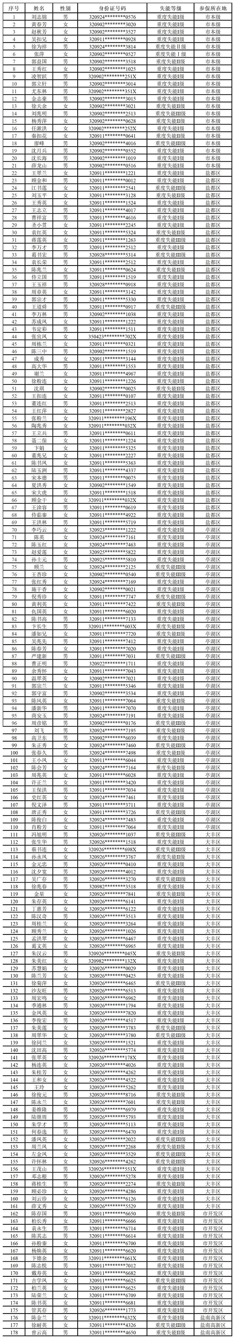 根据《盐城市长期护理保险失能等级评估管理办法》规定,经综合评估,拟确定以下178名参保人员符合盐城市长期护理保险重度失能等级标准,现予以公示。公示期限为5个工作日。