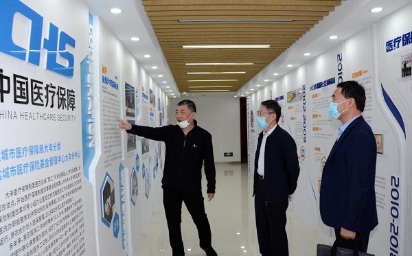 在医保文化长廊,范建江局长详细了解大丰医保改革历程和工作取得的成绩,对大丰分局医保工作表示肯定。