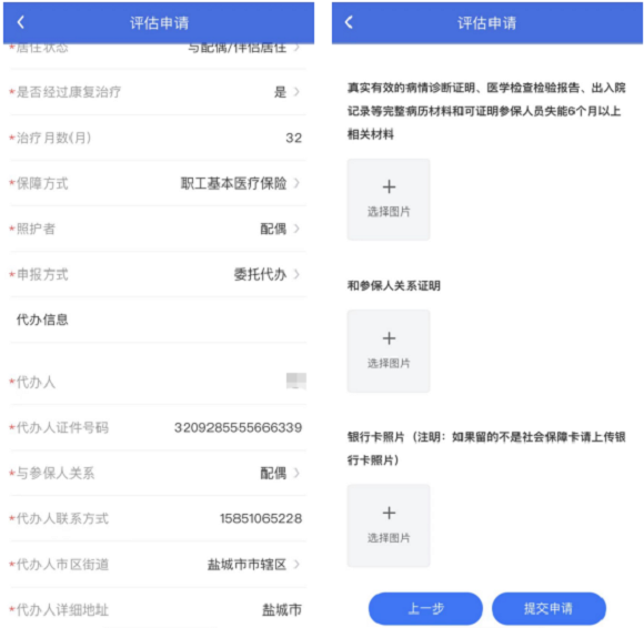 3.系统智能化审核参保人员自我评估结果,自评结果识别为重度失能的人员,自动跳转进入“信息填写”和“资料上传”页面。