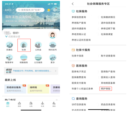 第一步:进入“我的盐城”APP,点击“社保”专区,选择“医保服务”中“照护保险”菜单,进入“盐城照护险”线上办理主界面。