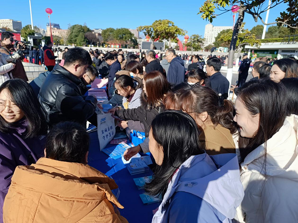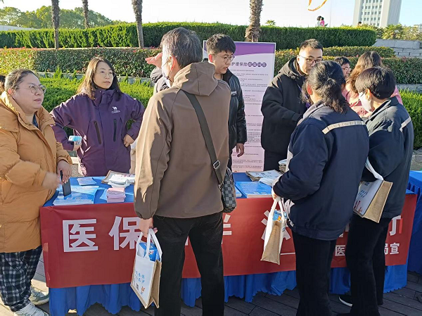 12月5日上午阳光明媚,盐城市世纪公园广场人头攒动,宣传展台在广场内依次排列。医保展台前悬挂“医保相伴 法治同行”的标语横幅,前来咨询医保法规政策的群众络绎不绝。“门诊特殊病有哪些?”“异地就医如何办理?”“新生儿参保有什么要求?”“您明年的居民医保已经缴纳了吗?”,工作人员热情地回答群众的问题,现场互动热烈。