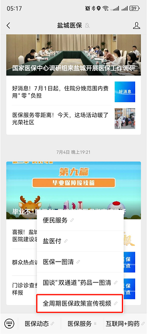 《集锦》将分批次通过“盐城医保”微信公众号进行发布播放,广大参保群众也可通过“盐城医保”公众号中“医保服务”功能中的“全周期医保政策宣传视频集锦”模块或者“盐城市医疗保障局”门户网站“网上服务”版面中的“全周期医保政策宣传视频集锦”模块按需进行点播。