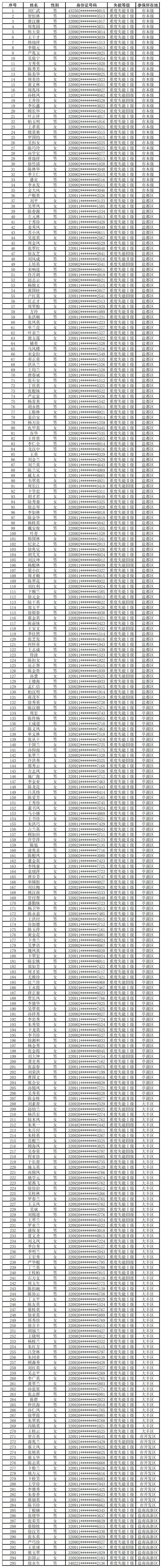 根据《盐城市长期护理保险失能等级评估管理办法》规定,经综合评估,拟确定以下295名参保人员符合盐城市长期护理保险重度失能等级标准,现予以公示。公示期限为5个工作日。